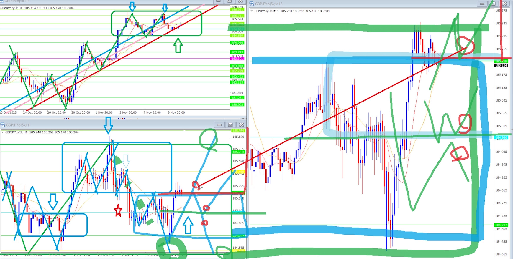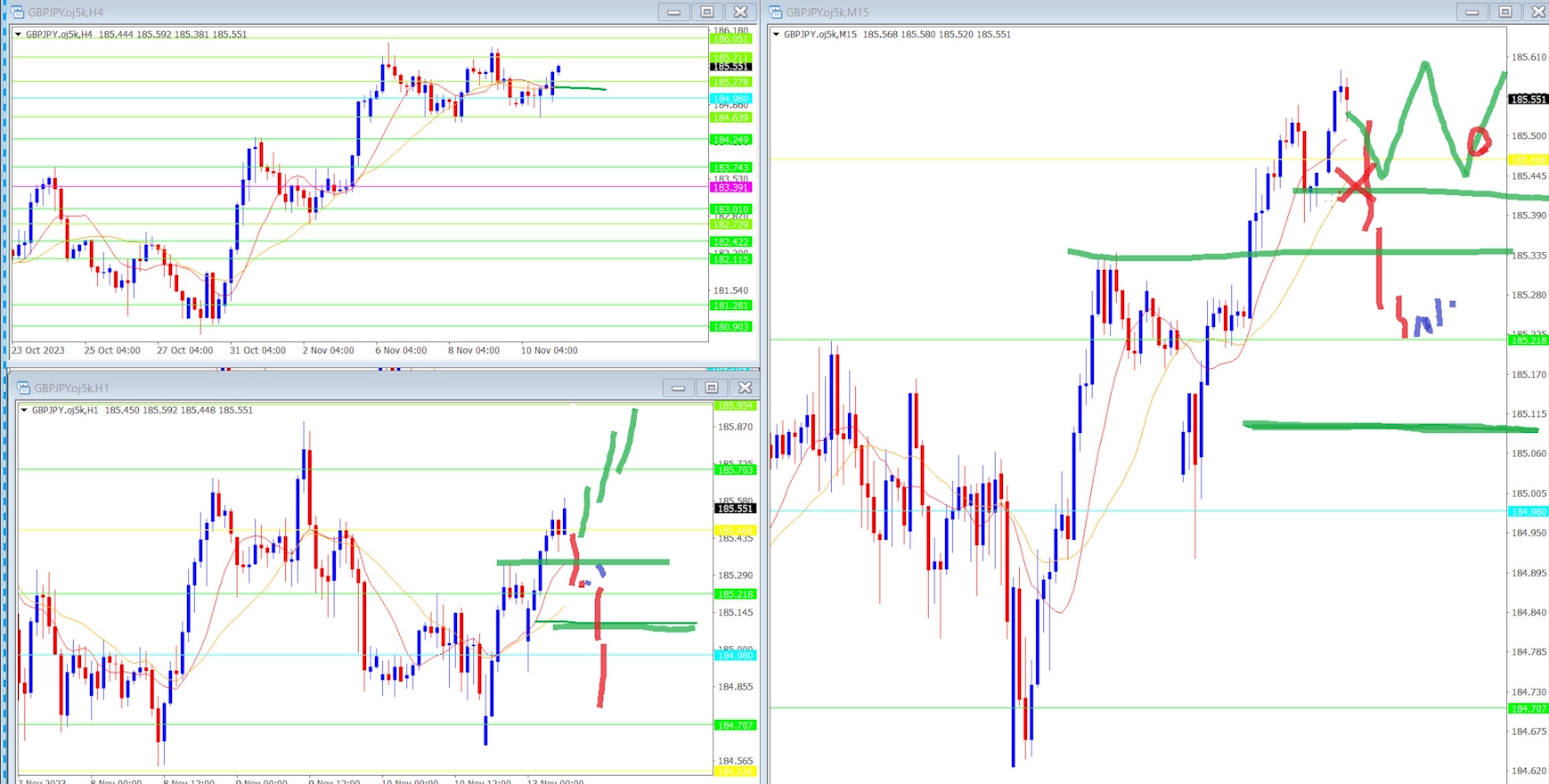 本日のシナリオです。上位足は切り上げ、4H足もレンジ下限で押し目感、1H足は切り上げて上昇中。
